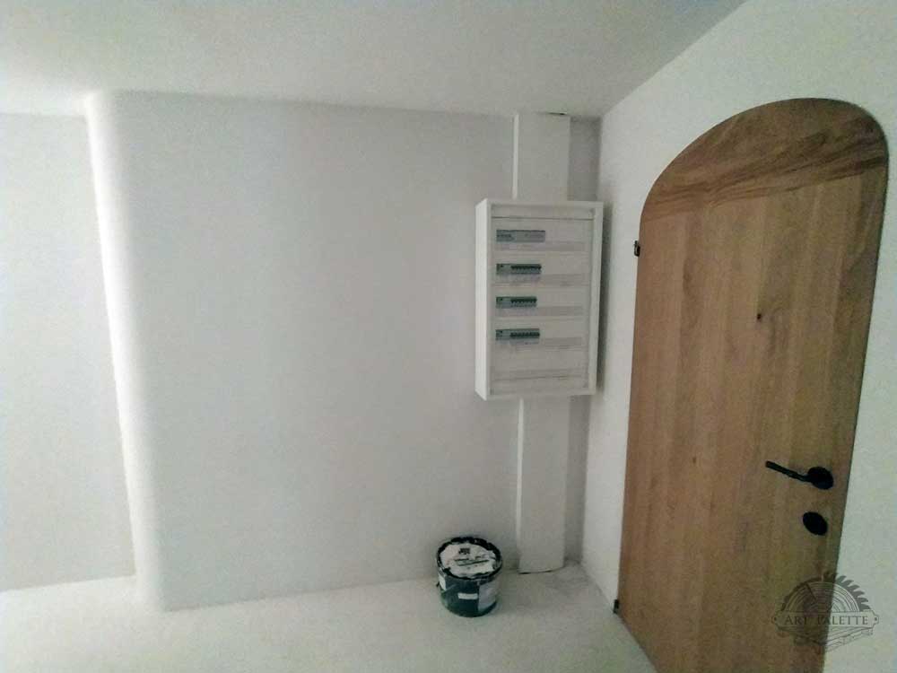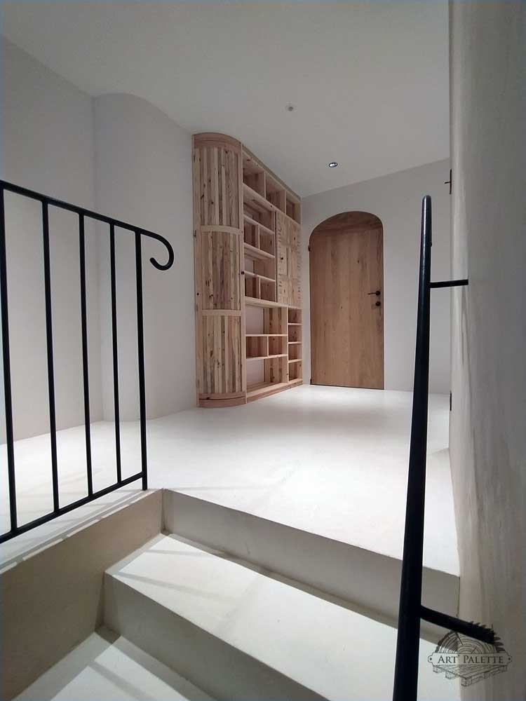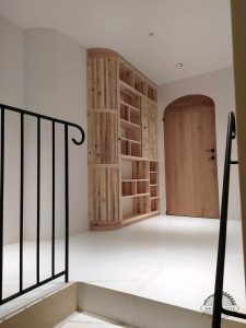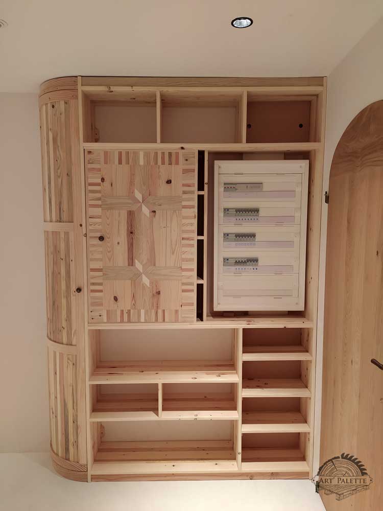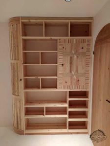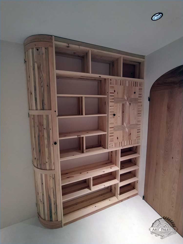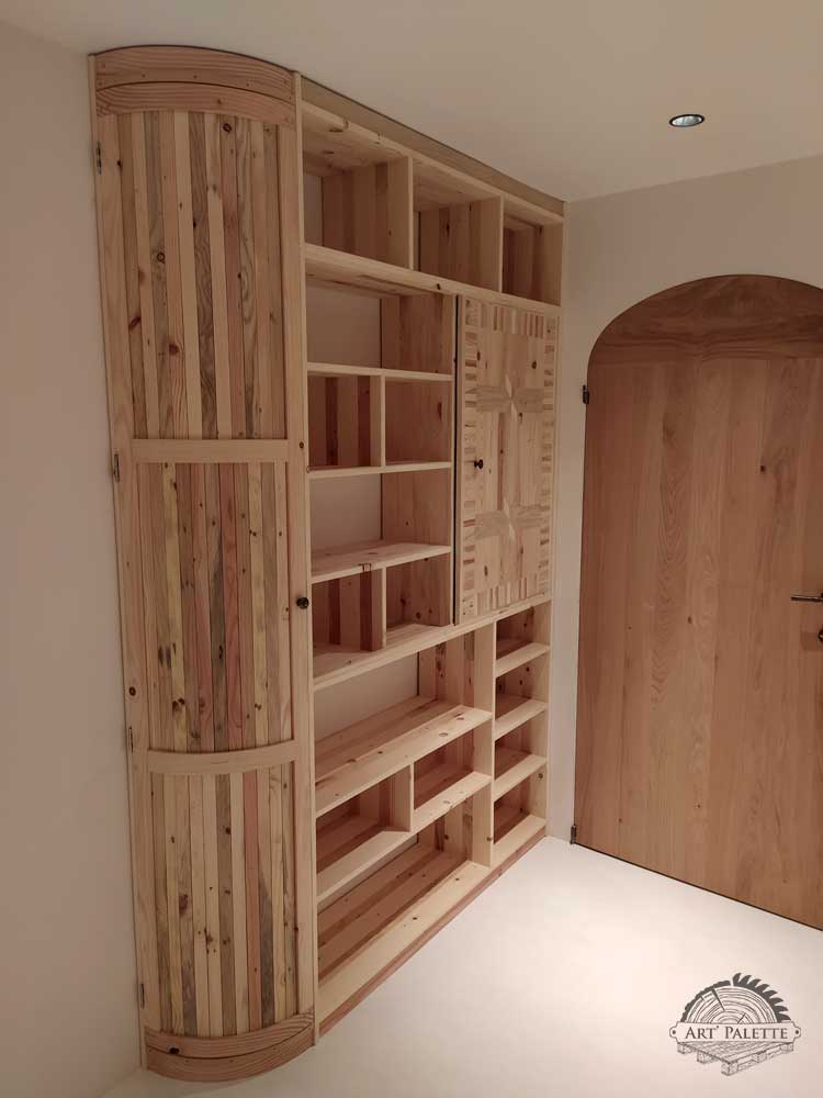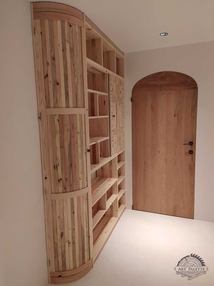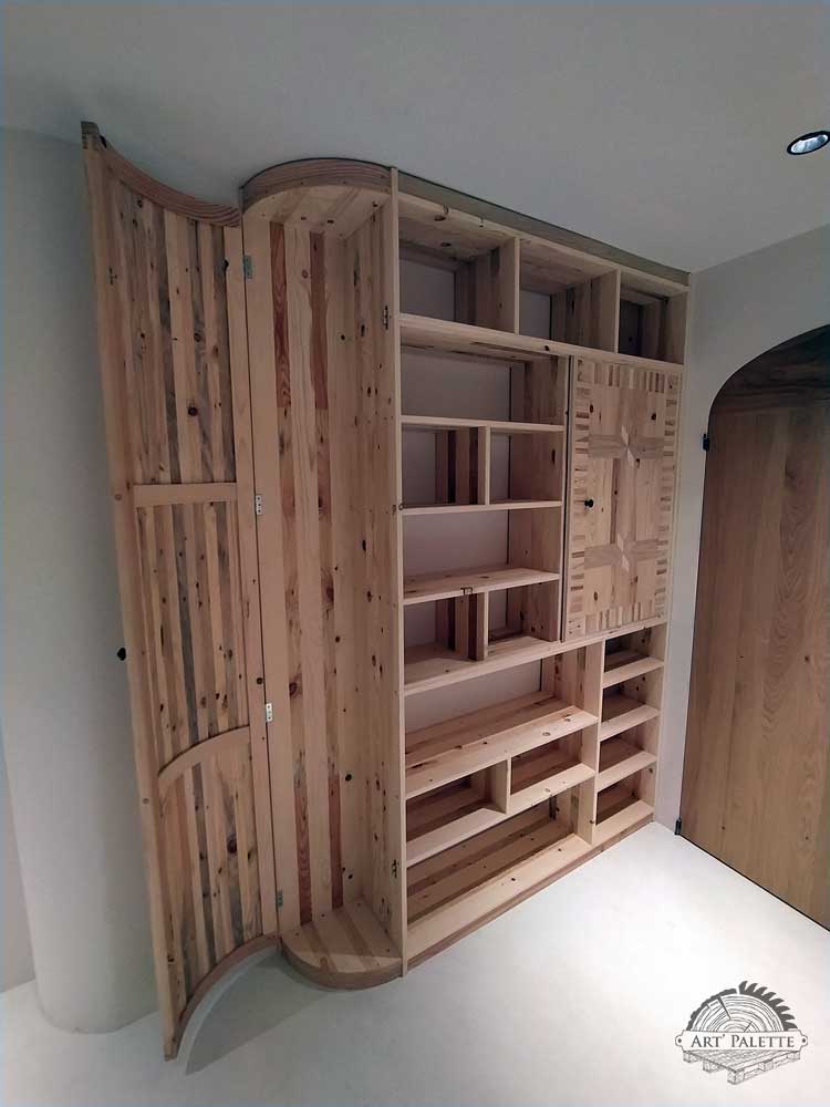 Ici, à la demande de mes clients, j’ai réalisé sur mesures une bibliothèque pour cacher une compteur électrique en bois de palettes, avec une porte coulissante et une porte courbée.Dimensions : 235 x 160 x 30 cm