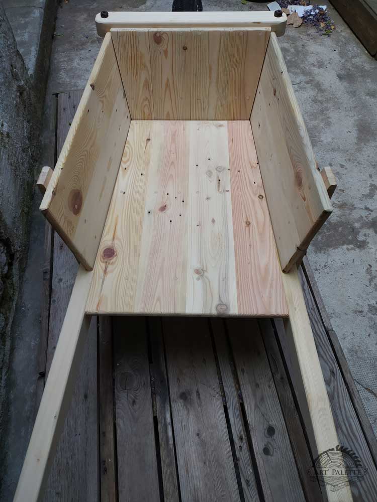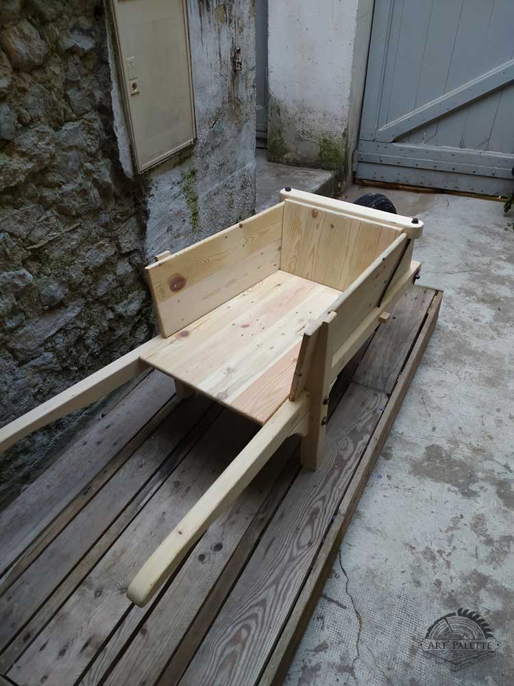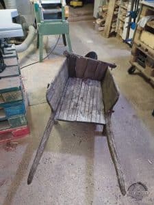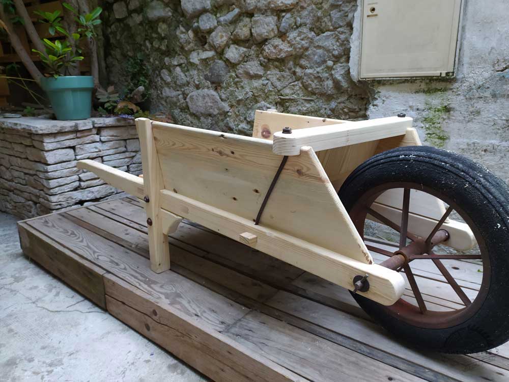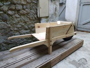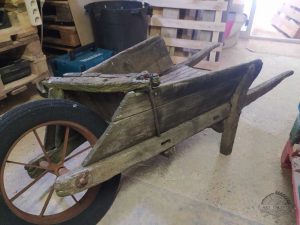 Ici, à la demande de ma cliente, j’ai refait à l’identique une ancienne brouette en bois de palettes, en conservant toutes les ferrures d’origine.