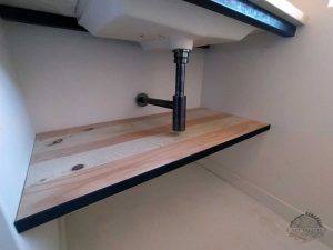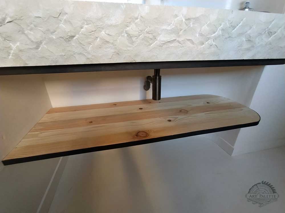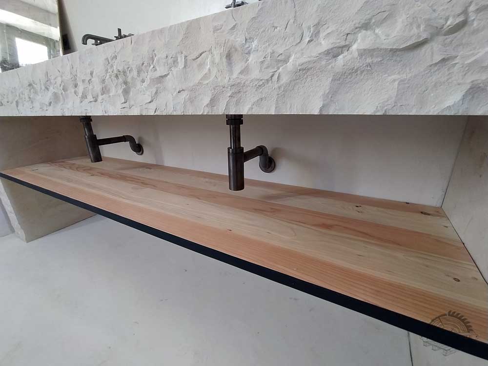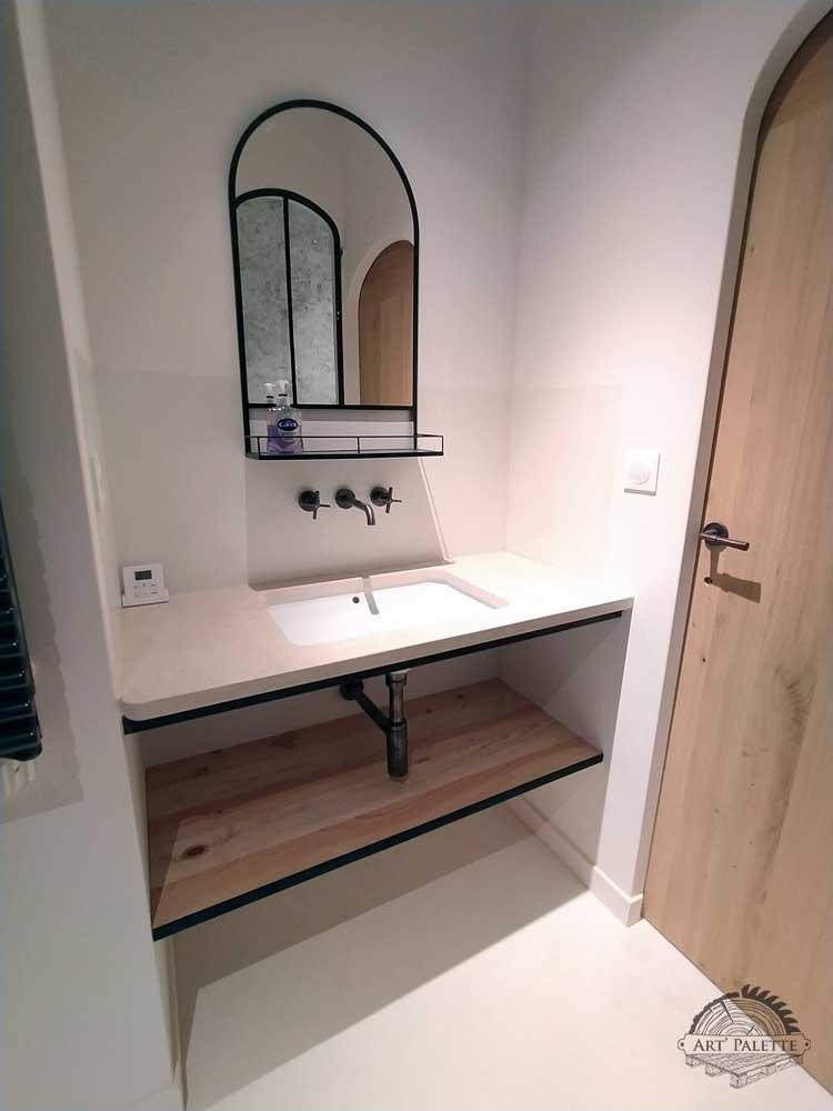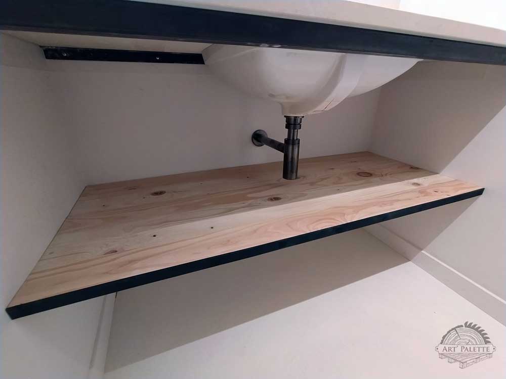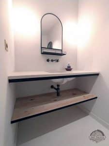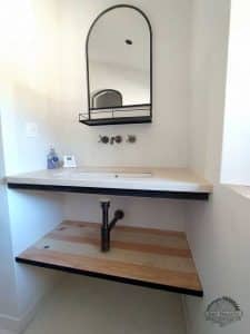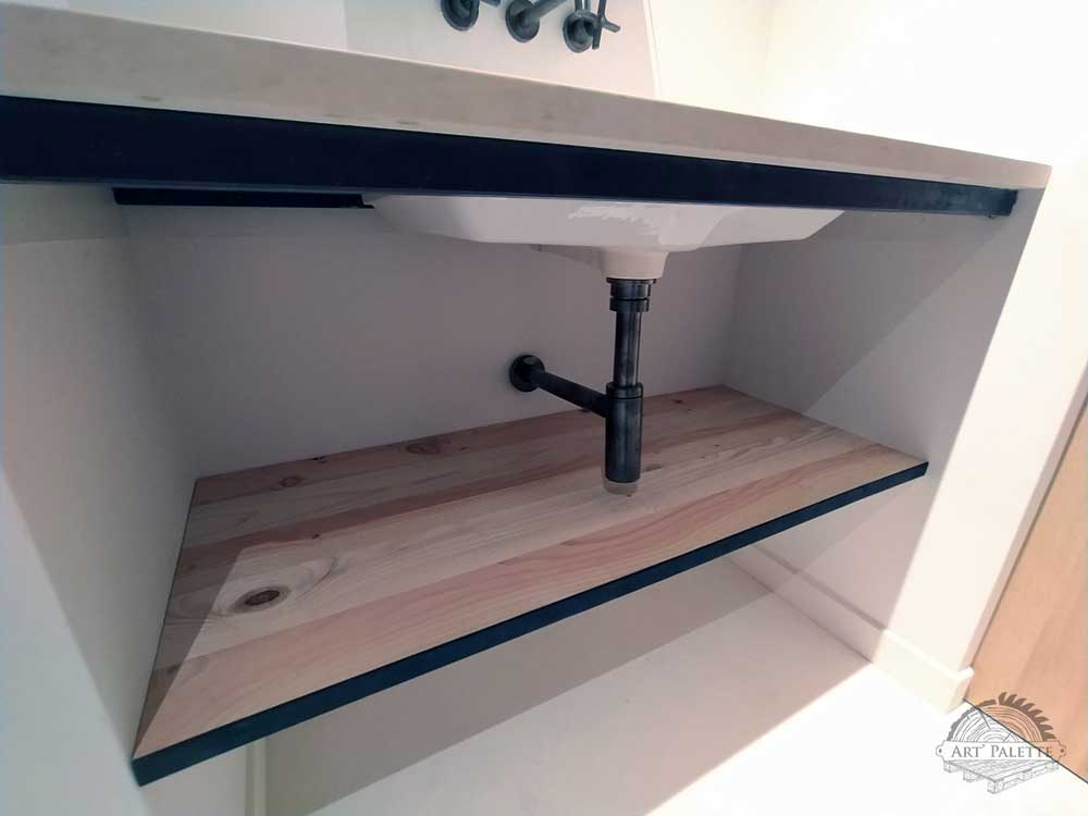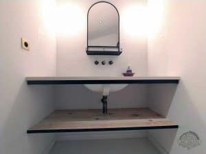 Ici, à la demande de mes clients, j’ai réalisé sur mesures des étagères de salle de bain en bois de récup’, sapin et douglas, avec baguette en bois peinte en façade.