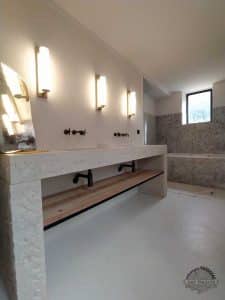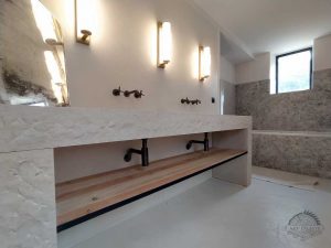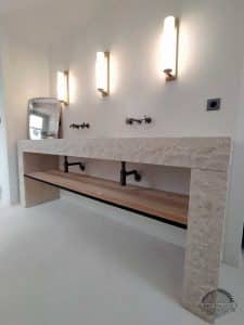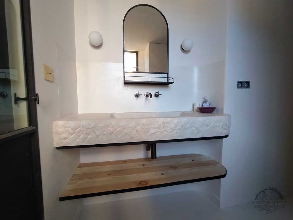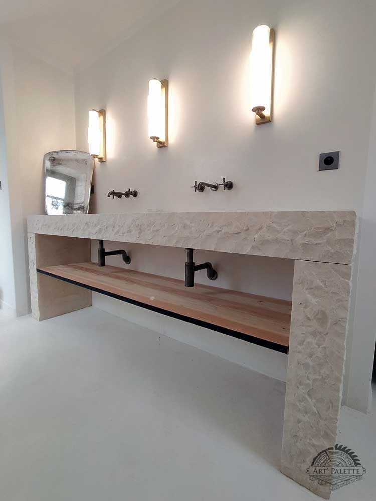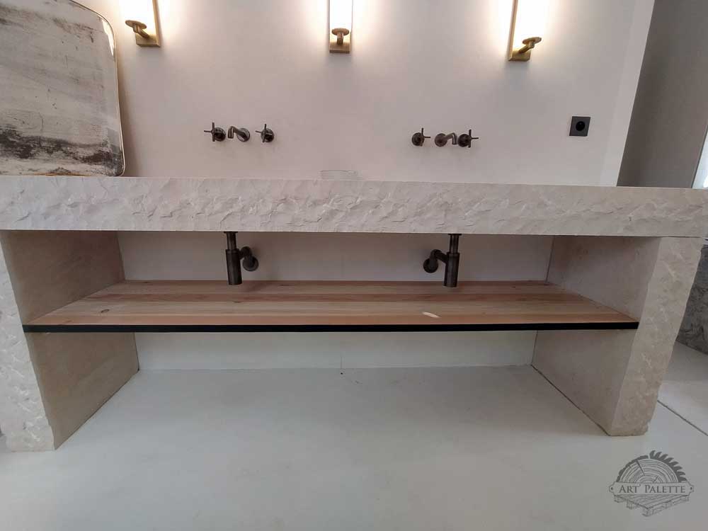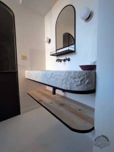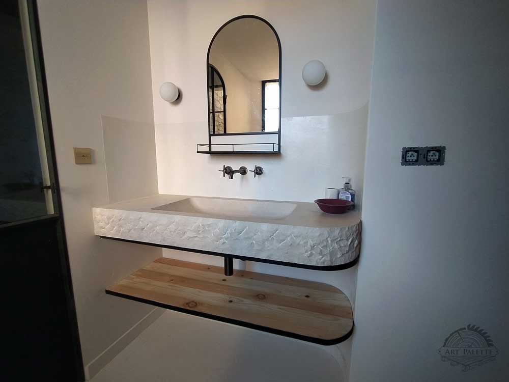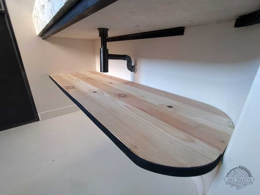 Ici, à la demande de mes clients, j’ai réalisé sur mesures des étagères de salle de bain en bois de récup’, sapin et douglas, avec baguette en bois peinte en façade.