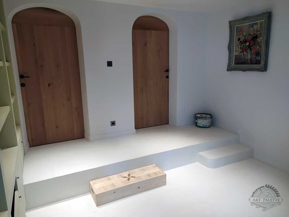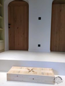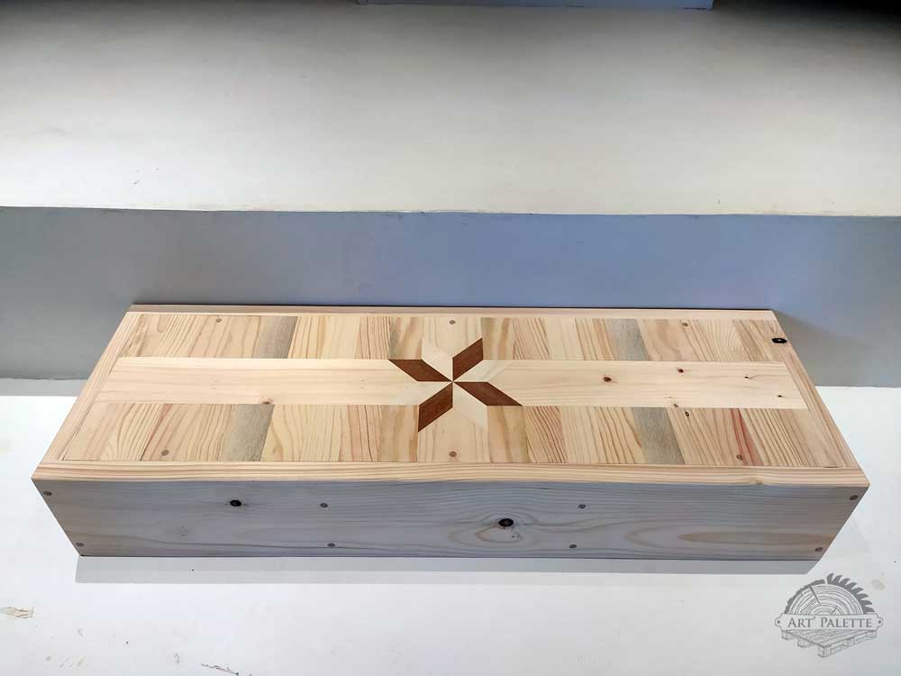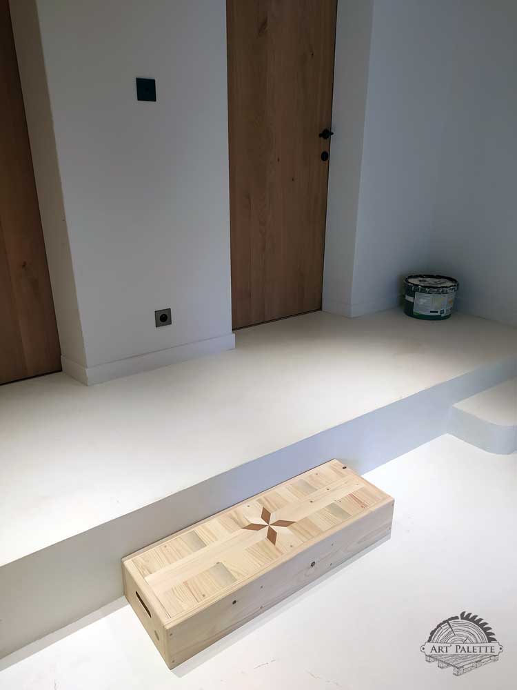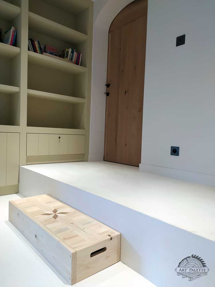 Ici, à la demande de mes clients, j’ai réalisé sur mesures une marche d’escalier en bois de palettes.Dimensions : 85 x 30 x 15 cm